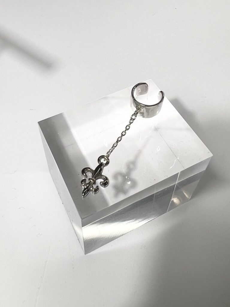耳元にフィットするミニマルなカフから、繊細なチェーンが優雅に揺れ、その先で輝くフルードリスが視線を惹きつけます。