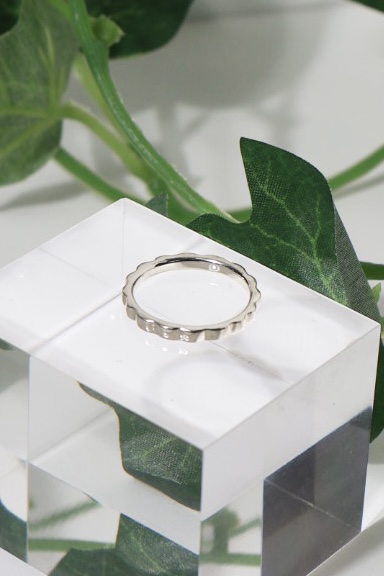 シンプルな形の中にリング表面に刻まれた凹凸が特徴で、シンプルな中にも程よい個性を感じられるリングに仕上がりました。
