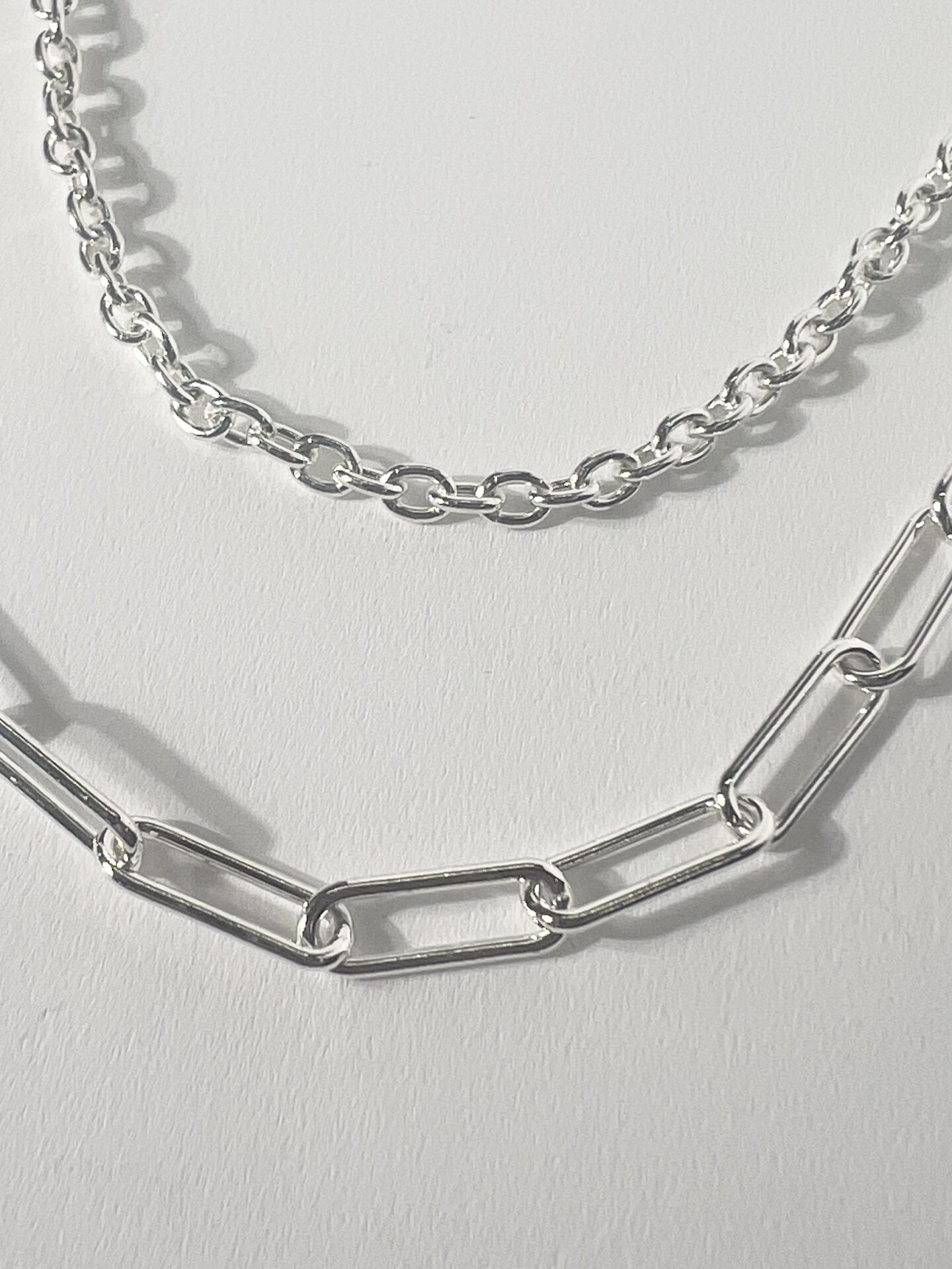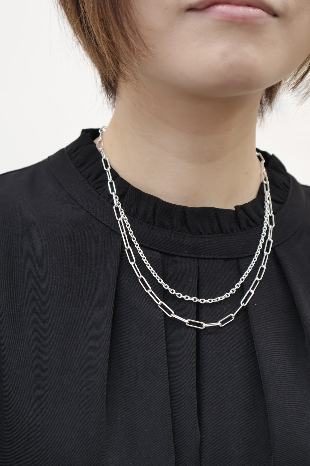 ひとコマの大きさが異なるチェーンを組み合わせたデザインのツインチェーンネックレス。